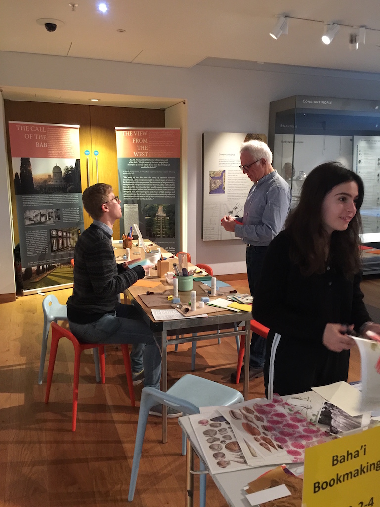 In 2019 I repeated the workshops at the Ashmolean Museum’s One World Festival with the support of Esmyr, Sam Cleasby and an Oxford Bahá’í youth, Flora Moayed. Participants would make booklets, decorating them with beautiful images, they’d cut from magazines, and spiritual aphorisms in handwritten calligraphy mainly from the Bahá’í Writings. This time, being the year of the Bicentenary of the Báb, we had organised very large ‘pop-up banners’ near our craft table about the Báb and the Bahá’í Faith and members of the public were reading those and asking questions. The event was so popular that the Museum afterwards told us that they’d like to give us more gallery space in future festivals to enable more people to participate in this activity.