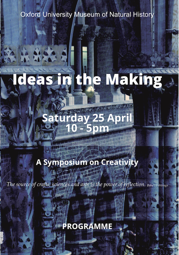 In recent years we collaborated with Laura Degenhardt and Sam Cleasby, Bahá’ís in nearby Oxford, and organised a very well-attended and well-received creativity symposium called Ideas in the Making at the University of Oxford Natural History Museum in April 2015. The theme was inspired by the Bahá’í quotation “the source of arts, crafts and science is the power of reflection”.