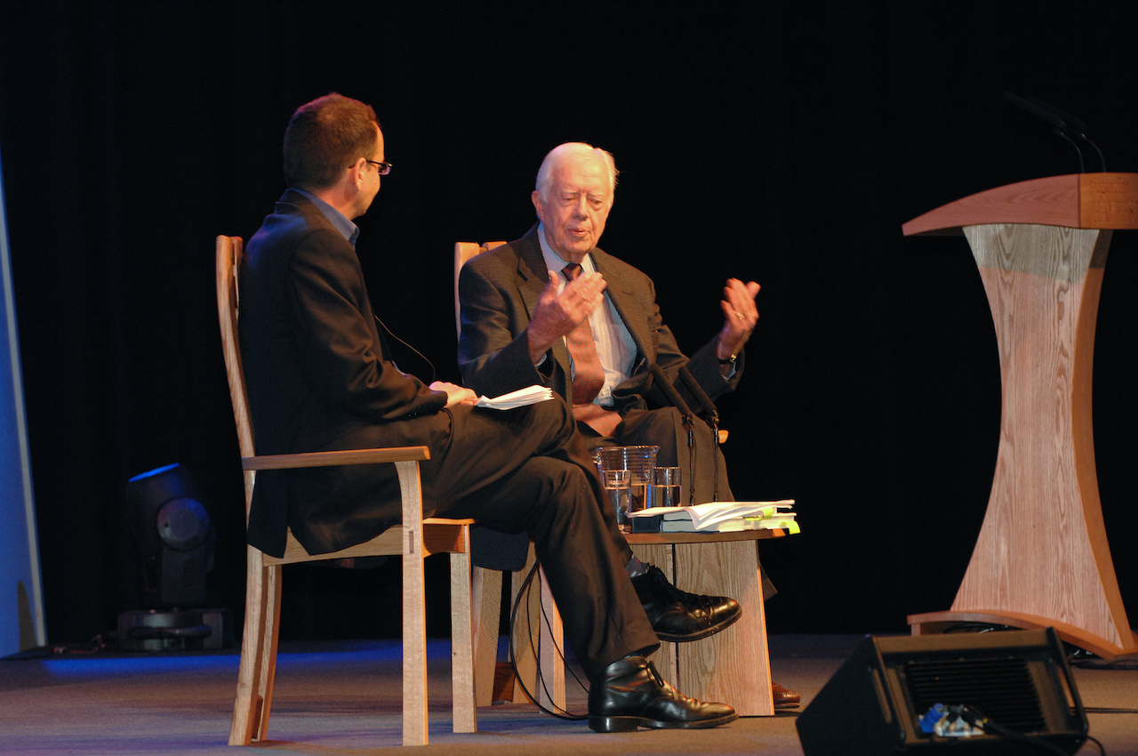 Former US president Jimmy Carter being interviewed by Philippe Sands at Hay Festival 2008