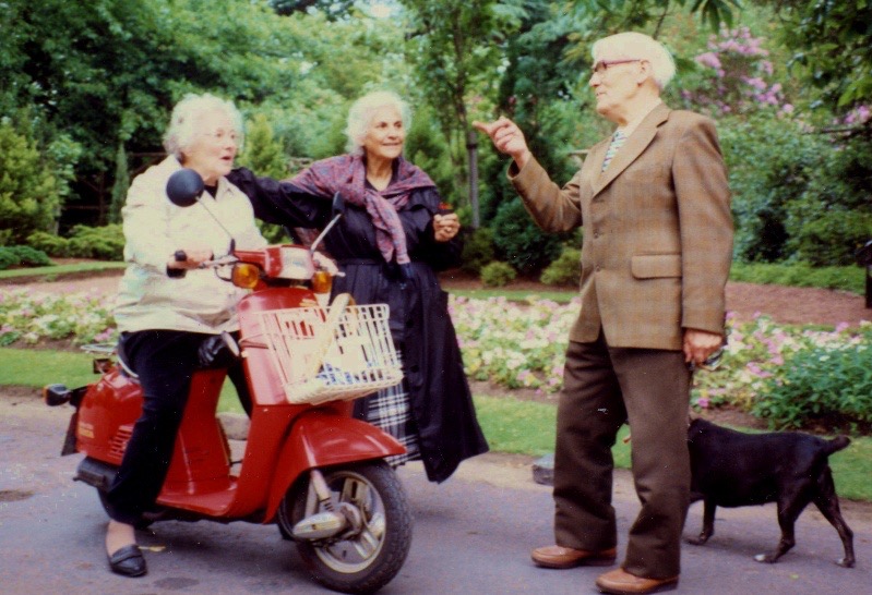 The photo shows Afagh with Mum, Dad and Zeba (Afagh’s dog) in the Dollar Park. You can see Mum’s folding walking stick in the front basket. She needed it to walk any distance without the moped, to support her. In case you are wondering, I’m holding Mum’s helmet while they chat.)