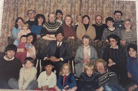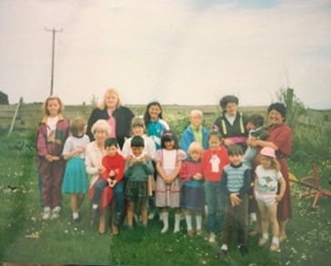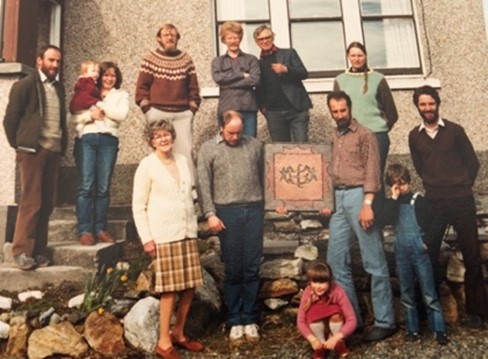 1985 at Ray and Mina’s house in Sheshader, Point, Isle of Lewis; Front Row; Alma Gregory (Lewis), Peter Bird (Uist), little girl sitting Jessica Day, Tony Day (Uist) little boy (one of Day’s children) Daniel, Lyndon Payne. Back Row; Graham Barnes, Mags Bartlett, with baby Helen, Roddy Grant (Lewis), Barry Bartlett, Harold Lane (Lewis), Wendy Day.