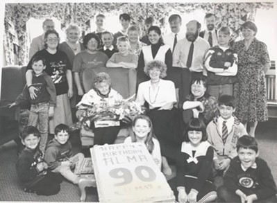 1994 Alma Gregory’s 90th birthday with Bahá’í friends; Standing left to right Richard Baker Harry and June Baker, Ann Moqbel, Mina Sheppard, Matthew Emerson, Marianne Moqbel, Tessa Emerson, Sam Moqbel, Sandra (Alma’s home help) Richard Emerson, Rhiannon Sheppard, Ray Sheppard, Royce Emerson, Dr Brian Walker, Ben Emerson, Liz Emerson. Sitting left to right; Kamran Sheppard, Christopher Baker, Alma Gregory, Alex Emerson, Lois Lambert, Ann Shaw, Rosemary Sheppard, Vahid Walker, Kalim Sheppard.