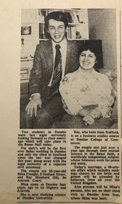 We had a lovely Bahá’í wedding in Dundee, officiated by a wonderful Bahá’í marriage officer from East Lothian, Commander Surgeon John More Nisbet. My parents came over from Iran and the wedding became a source of proclamation for the Faith in the local newspaper, the Dundee Courier, as the first officially-recognised Bahá’í wedding in Dundee.