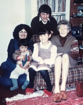 1985: Left to Right, Mina, Rosemary (1) on lap, Rhiannon (5), Ray, with Bahá’í friend Alma Gregory